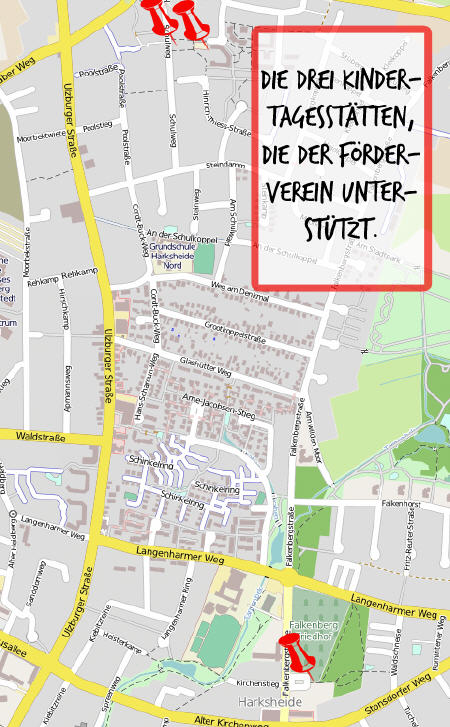 Wo liegen die Kindertagesstätten? Schauen Sie auf die untenstehende Grafik, beim Überfahren mit der Maus erhalten Sie Informationen über die Kitas, beim Klicken werden Sie zur jeweiligen Homepage weitergeleitet.